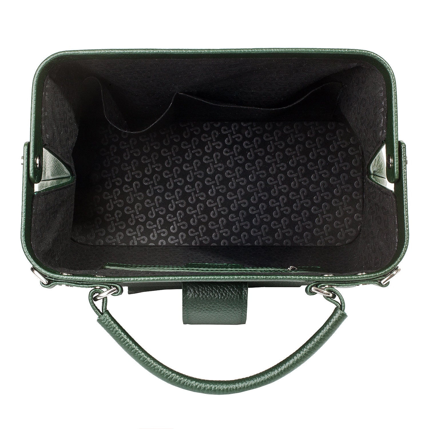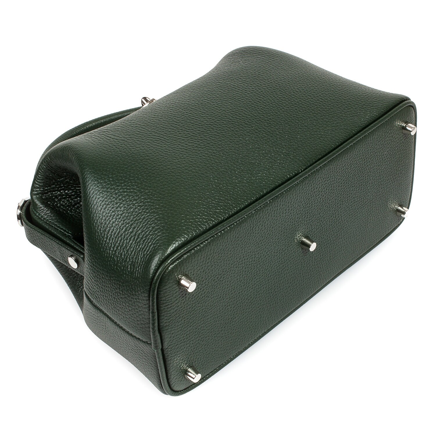 Women's leather doctor bag made of genuine leather, hardware with galvanic coating and microfiber lining. The internal space of a bag is equipped with one spacious compartment, two patch-pockets and one zipper pocket. The bag is closed with a clasp. The kit also includes a storage bag.