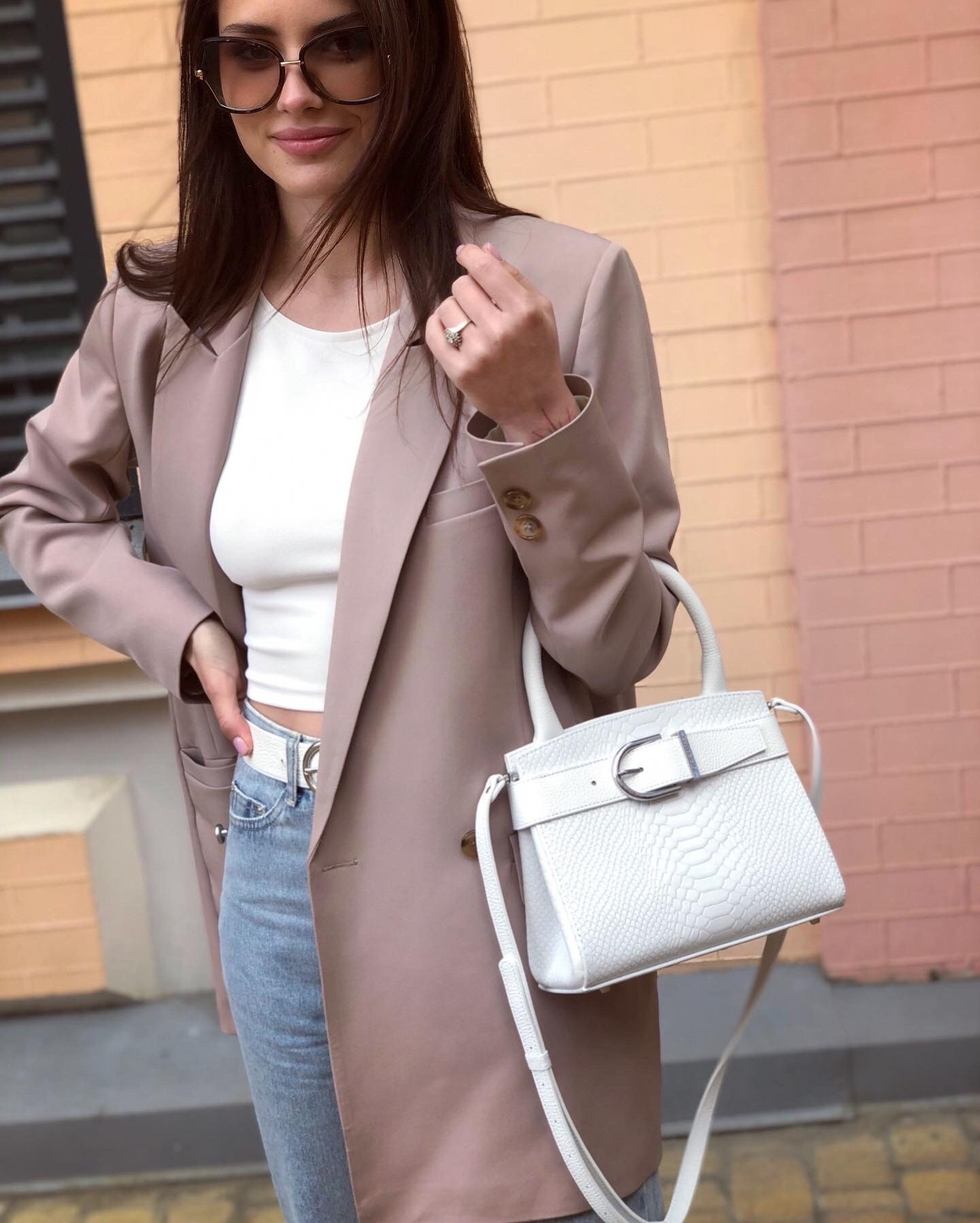 Women's leather bag made of genuine leather, hardware with galvanic coating and microfiber lining. The internal space of a bag is equipped with three spacious compartments and two patch-pockets and one zipper pocket. Closes with 2 buttons magnet. The bottom of the bag is protected with metal legs. The kit also includes a storage bag.