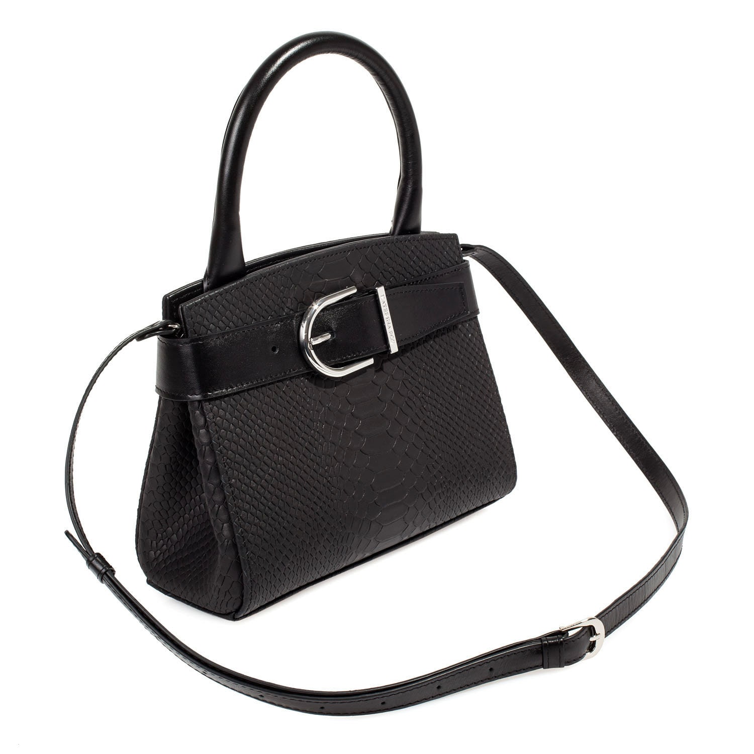 Women's leather bag made of genuine leather, hardware with galvanic coating and microfiber lining. The internal space of a bag is equipped with three spacious compartments and two patch-pockets and one zipper pocket. Closes with 2 buttons magnet. The bottom of the bag is protected with metal legs. The kit also includes a storage bag.