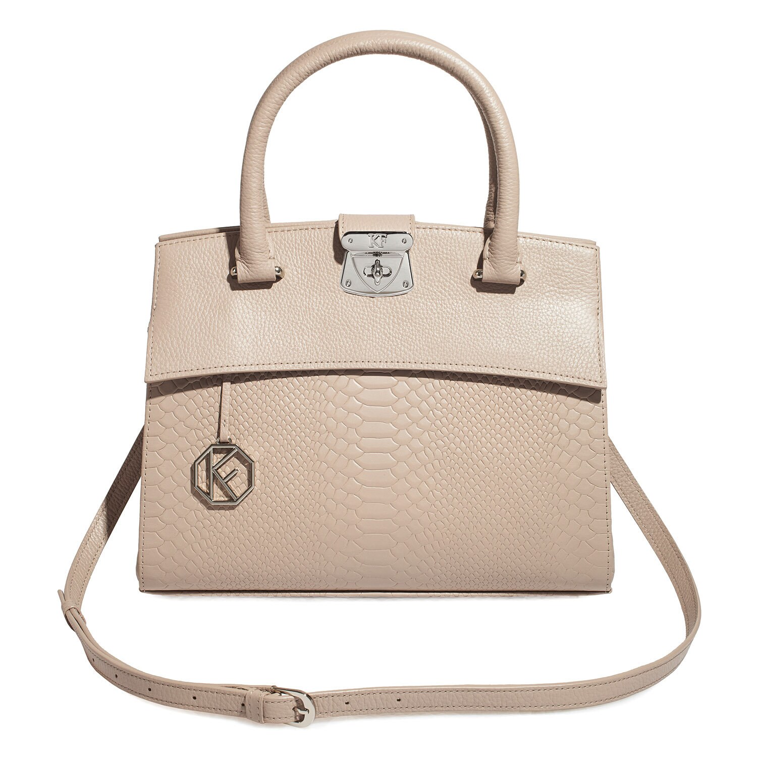 Women's leather bag made of genuine leather, hardware with galvanic coating and microfiber lining. The internal space of a bag is equipped with three spacious compartments and two patch-pockets and one zipper pocket. Closes with 2 buttons magnet. The bottom of the bag is protected with metal legs. The kit also includes a storage bag.